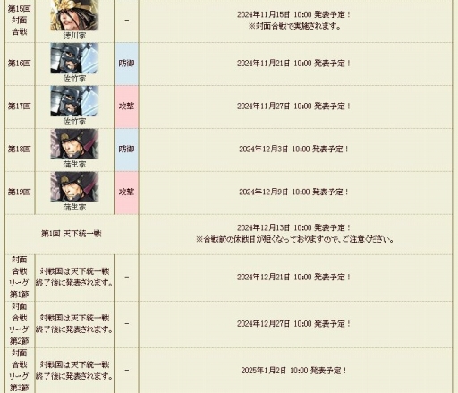 今後のスケジュールとしては,2024年12月21日から2025年1月20日まで,対面合戦に特化した「対面合戦リーグ」イベントが実施される予定だ。熟練プレイヤーはもちろん新規や中堅プレイヤーも楽しめる内容なので,興味を持った人はこれを機に「戦国IXA」を始めてはいかがだろうか。