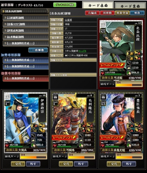 その一方で,攻守で面白さがけっこう分かれてしまう……というのもあった。攻撃に比べて防御側は受動的となるため,とくに新規プレイヤーにとっての防御戦は,正直なところ活躍の場がほとんどないという事態になりがちだ。基本的に所有する武将カードは攻撃陣を優先的に強化を進めるため,序盤は本丸や所領の防御陣形を組むための戦力が整わず,陥落に陥落を重ねる……といった状況になりやすい。