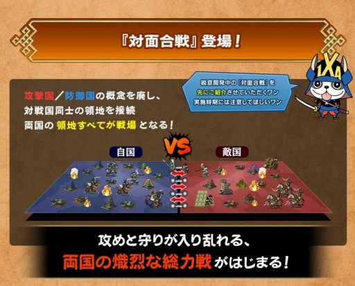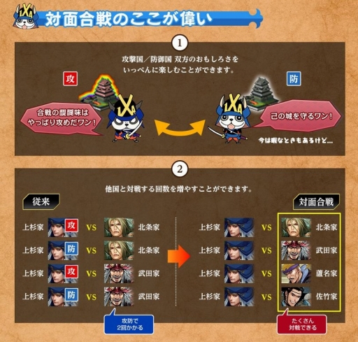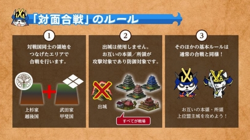 「戦国IXA」の新要素「対面合戦」は,現行バージョンの「梵龍天翔〜岐立十二龍門〜」でも従来型の合戦と並行して行われている。