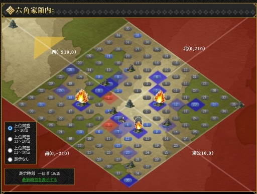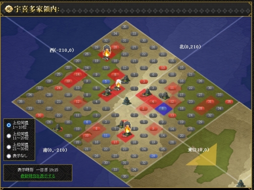 また,このあたりは相手の攻撃対象が分散しているためだろうか。従来の合戦では,防御側はもちろん攻撃側のときも熟練プレイヤー相手に手が出ず,ひたすら出城を落され続けるということがあったが,対面合戦ではそういう事態は回避しやすくなった感がある。警戒されないよう状況を見て部隊を進め,相手をかき回して自勢力の勝利に貢献するチャンスも得られるかもしれない。
