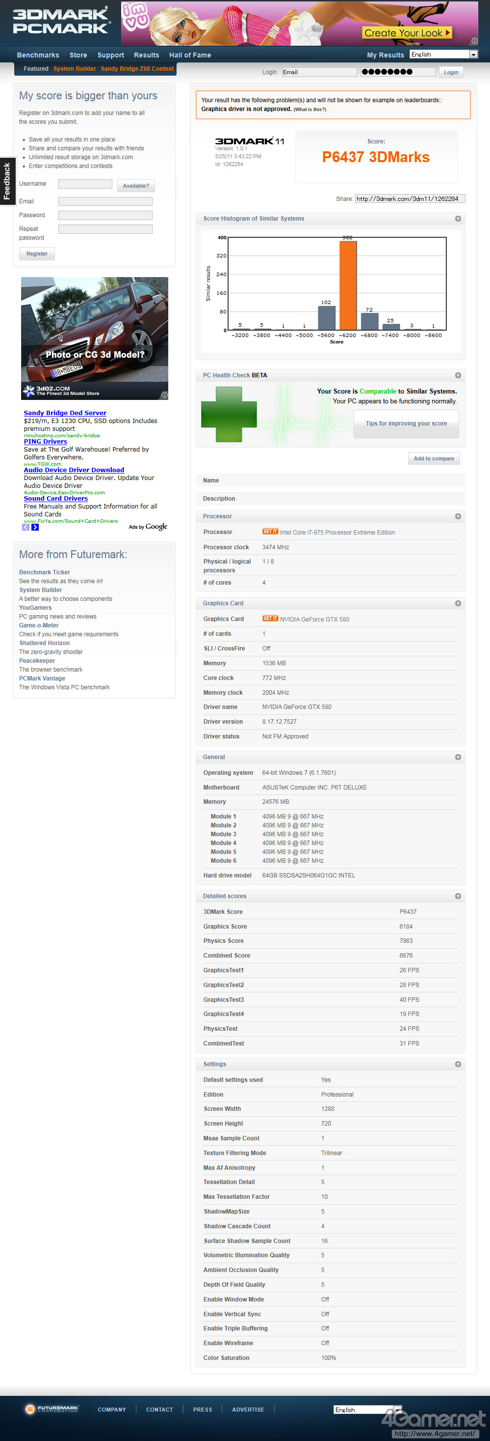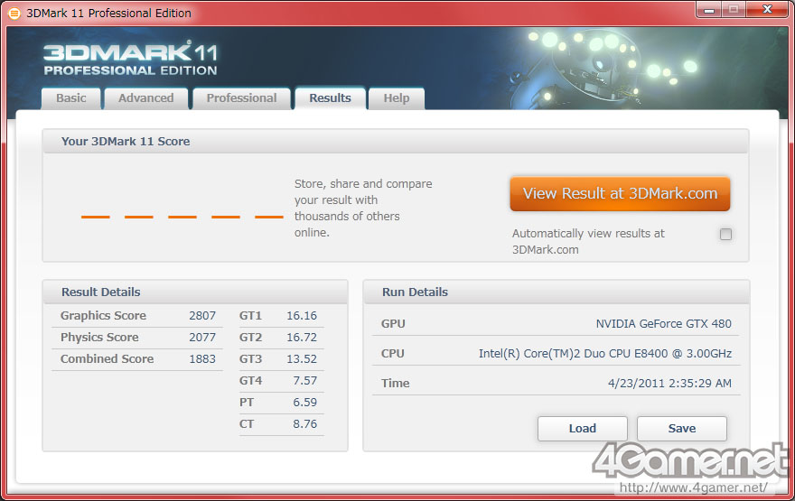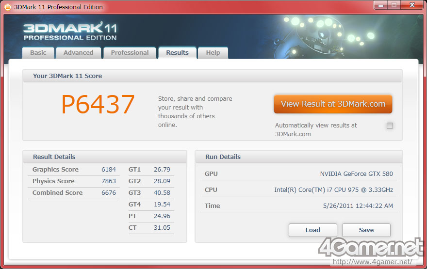 まずGraphics Test 1〜4のスコアからだが,これらはそれぞれ平均フレームレートがそれぞれ「GT1」〜「GT4」として求められる。3DMark 11のスコアをオンラインで確認したとき,「GraphicsTest1」〜「GraphicsTest4」と表示されるのがそれだ。ちなみにAdvanced Edition以上では,「Result」タブにそのままGT1〜GT4と表示される。