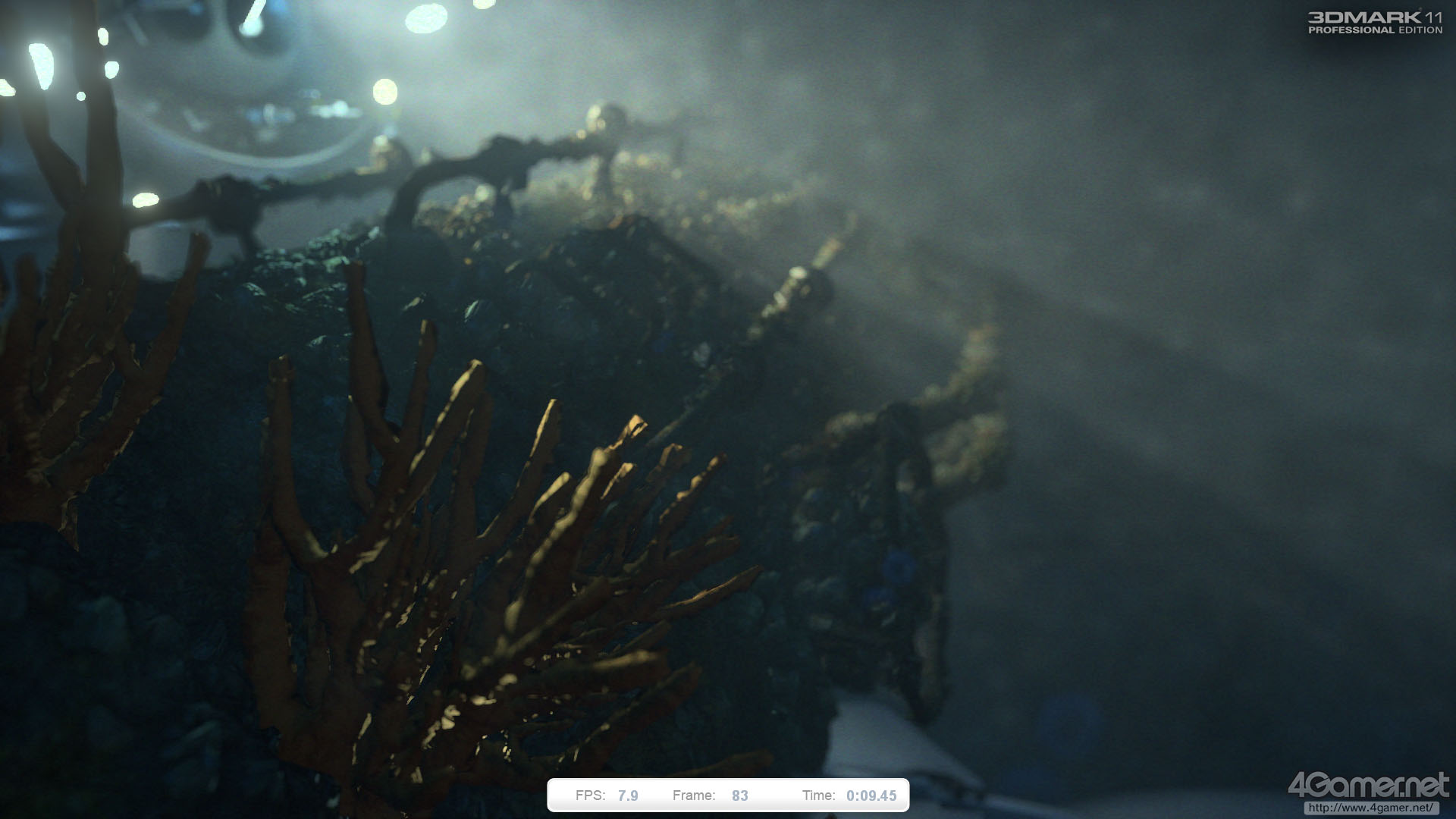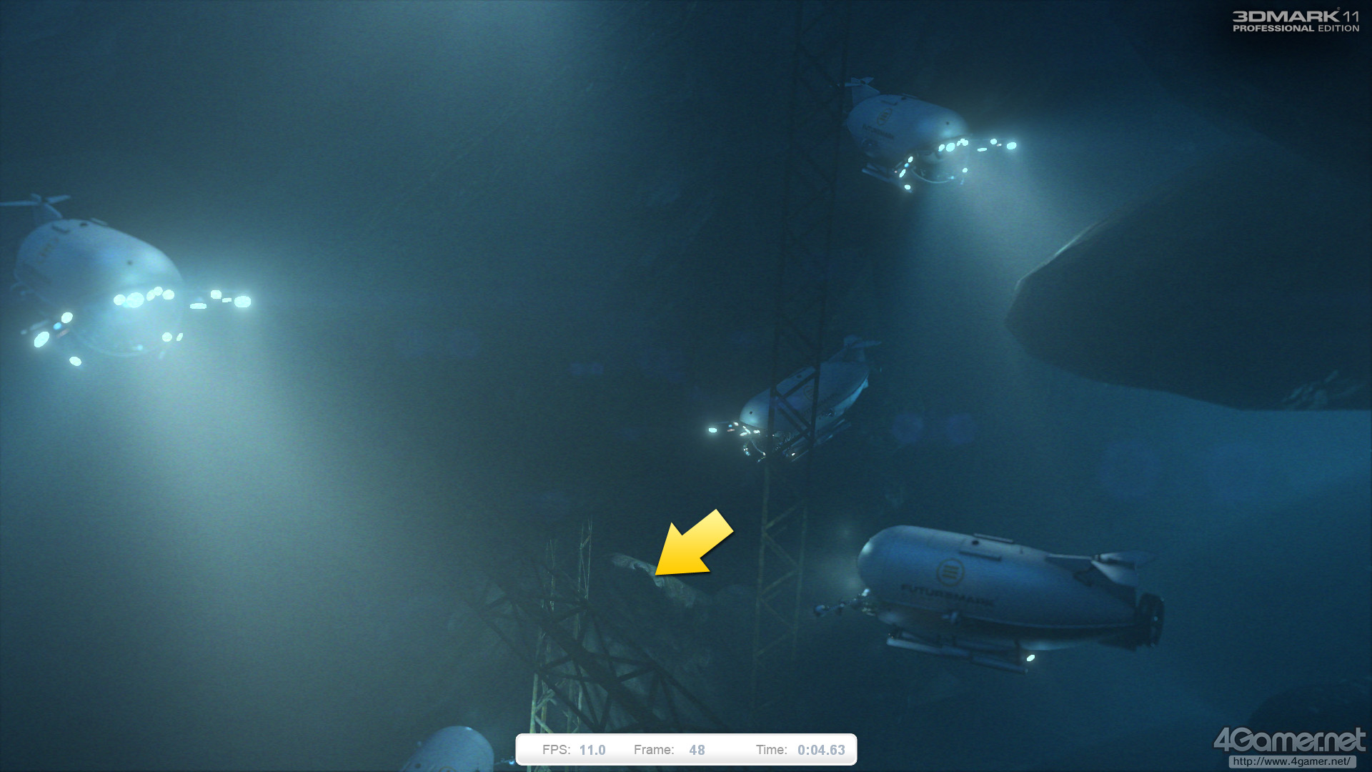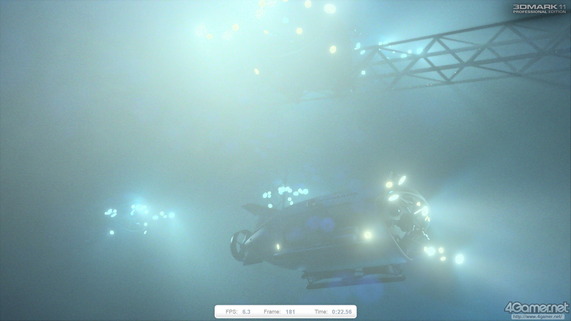“深海・パート2”的なシークエンスで,登場する潜水艇は1機だけ。そのため,光源数はGraphics Test 1と比べてかなり少ない。ただ,用いられている光源の種類自体はGraphics Test 1と変わっておらず,「スポットライトは影生成ありとなしの2パターン」「点光源は影生成に対応せず」というルールがそのまま引き継がれている。Volumetric Illuminationの結果としての,空間に伸びる影のように見える影部分もそのままだ。