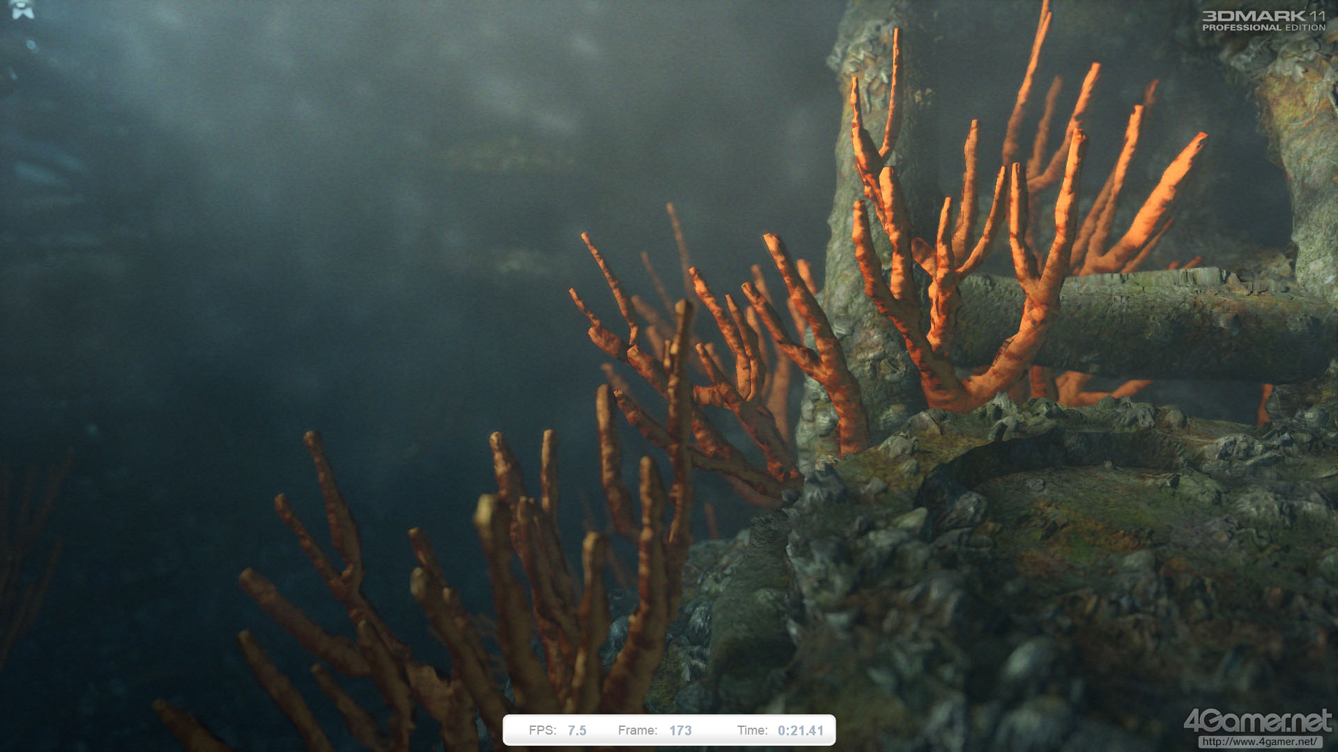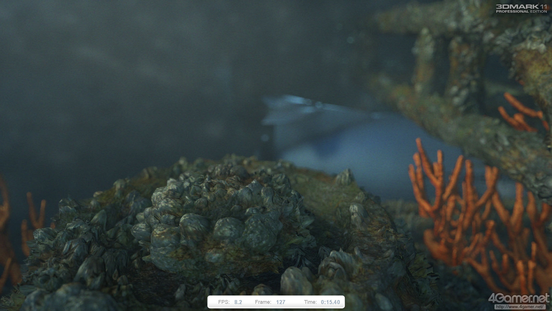 Graphics Test 1との大きな違いは,テッセレーションステージが積極的に活用されている点にある。海底に見える珊瑚礁や岩,フジツボのような構造物はすべて,テッセレーションとディスプレースメントマッピングによってディテールが与えられている。