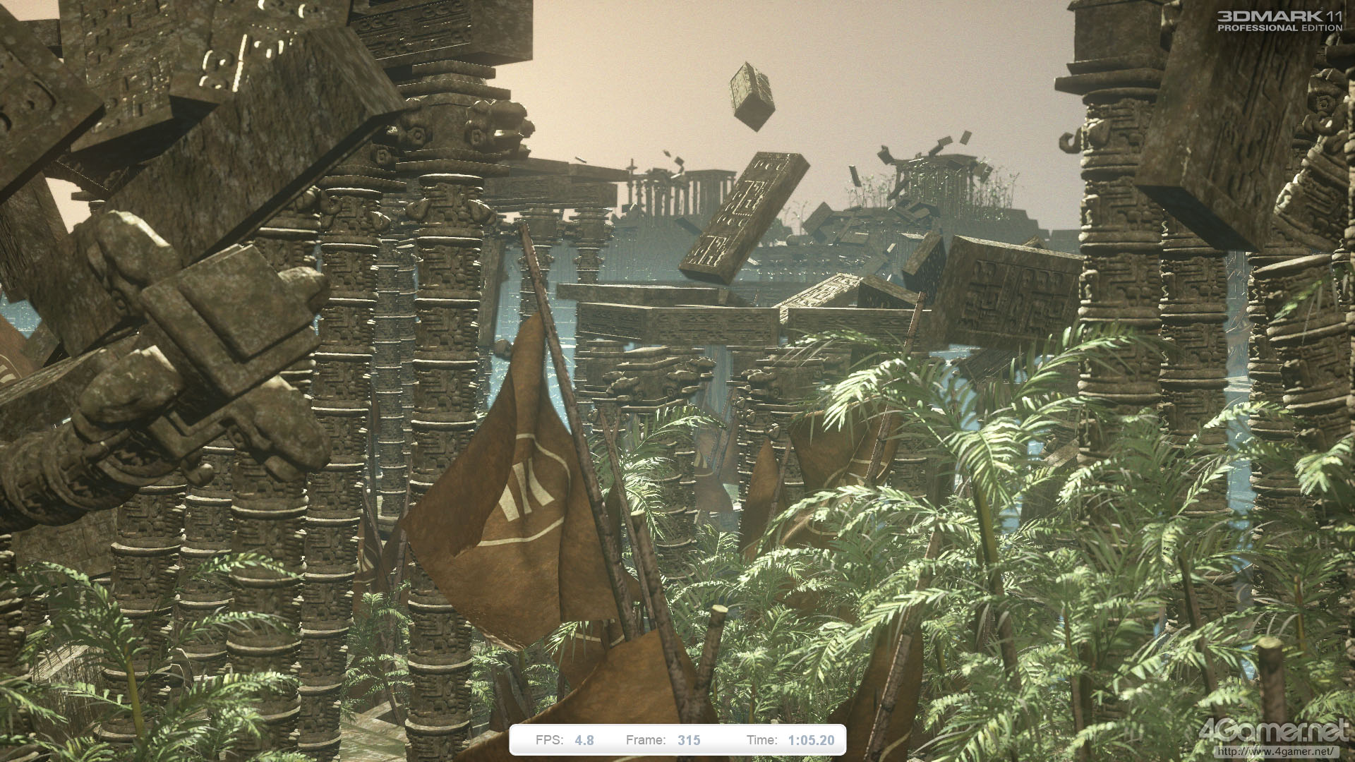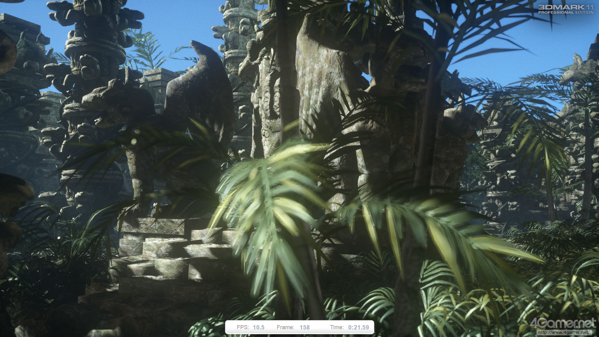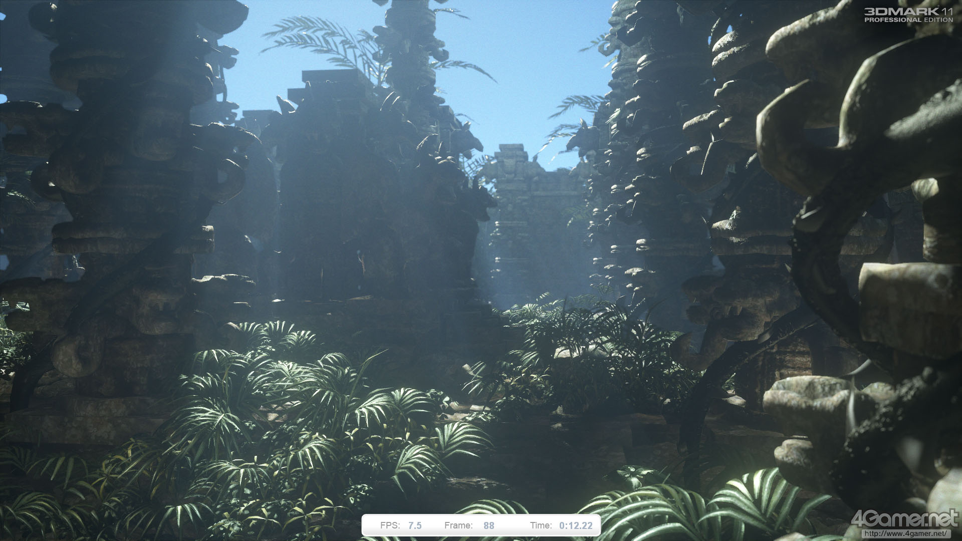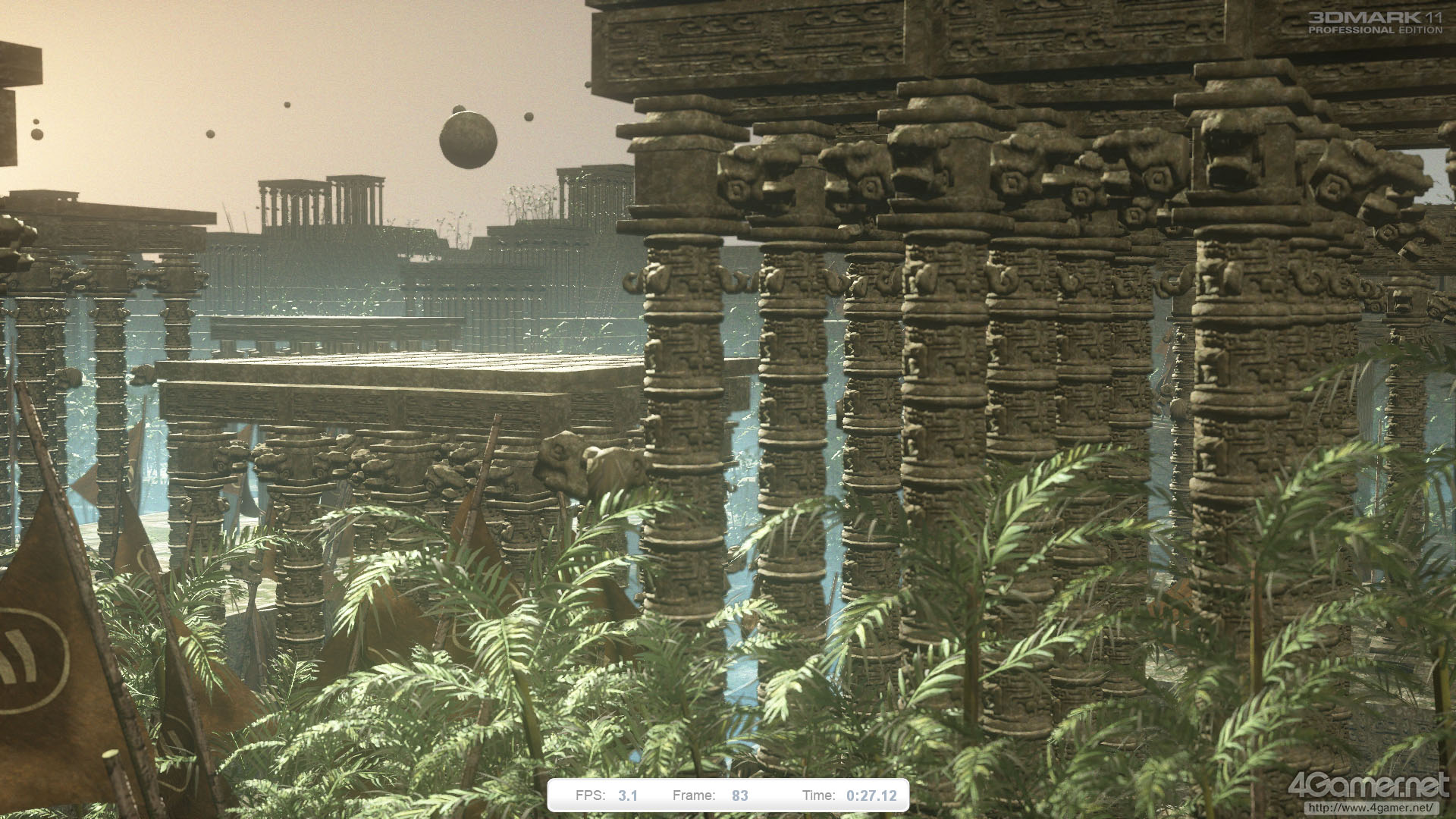 テッセレーションステージは,植物や石像,石柱の曲面表現やディテール生成に利用されている。あまり目立たないながら,レンズフレアや被写界深度などの効果にポストプロセスも利用されており,総じてGraphics Test 1&2と比べて負荷の高いテストになっているといえるだろう。