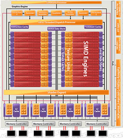 下に示したのは,左がBarts,右がATI Radeon HD 5800シリーズとなるCypressのブロックダイアグラムだ。公開されたBartsのダイアグラムが正確であることを前提に話を進めると,5基の「Stream Processing Unit」(以下,SP)が「Thread Processor」を構成し,さらにそのThread Processorが16基集まって「SIMD Engine」を構成し,テクスチャユニットやL1キャッシュとセットで1つにまとめられている点をはじめ,基本的なアーキテクチャはATI Radeon HD 5800シリーズとほとんど同じである。