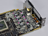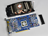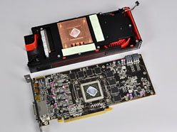 そのクーラーを取り外してみると,電源部が3+1フェーズのように見えるなど,多少の簡略化は見えるものの,基本的にはHD 6870のリファレンスデザインと似た設計になっていることが窺えよう。