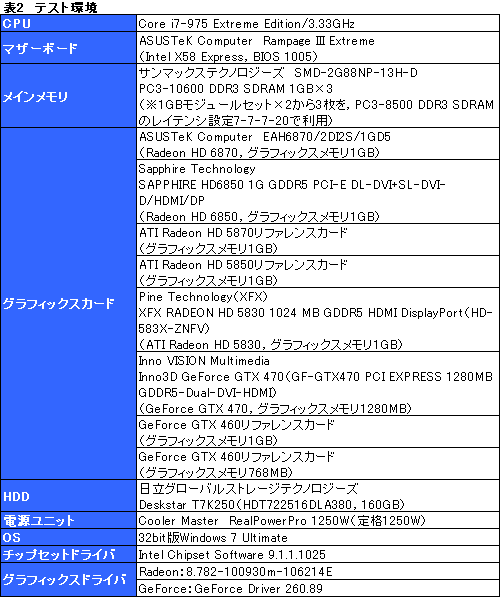 テスト環境は表2に示したとおり。置き換え対象となるHD 5850のほか,上位モデルにどこまで迫れるか,下位モデルに対してどれだけの差を付けるかを見るべく,HD 5870と,「ATI Radeon HD 5830」(以下,DH 5830)を用意した。上で紹介したとおり,EAH6870/2DI2S/1GD5はメーカーレベルでコアクロックが15MHz引き上げられたクロックアップモデルだが,今回はリファレンス相当にまで落としてテストすることをあらかじめお断りしておきたい。