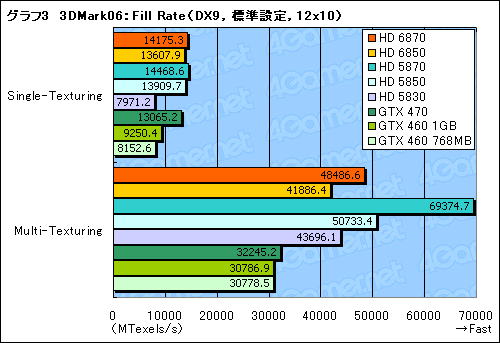 続いてグラフ3〜7は,3DMark06のデフォルトである解像度1280×1024ドット,標準設定における「Feature Test」のテスト結果をまとめたもの。まずグラフ3〜5は順に,Fill Rate(フィルレート),Pixel Shader(ピクセルシェーダ),Vertex Shader(頂点シェーダ)のスコアだが,SIMD Engine数がATI Radeon HD 5800シリーズよりも少なく,いきおいテクスチャユニット数も少ないため,よりテクスチャユニット性能がモノを言うMulti-TexturingでHD 6800シリーズは大きくスコアを落とした。ただ,それでもGeForceの3モデルに対しては十分に高い値だ。