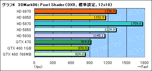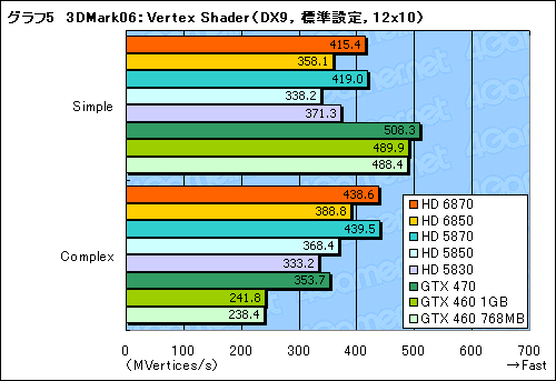Vertex Shaderだと,HD 6870とHD 5870がほぼ同じ。HD 6850がHD 5850より若干高いスコアとなった。