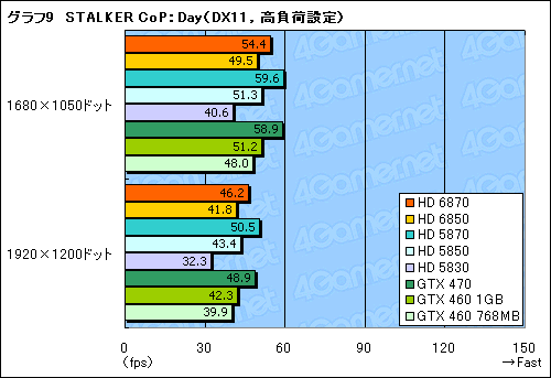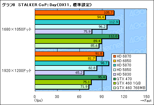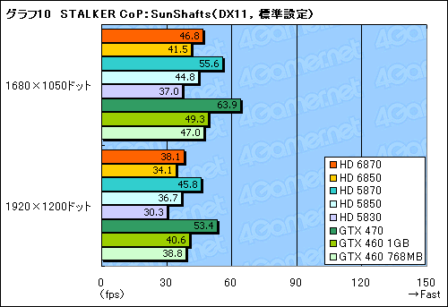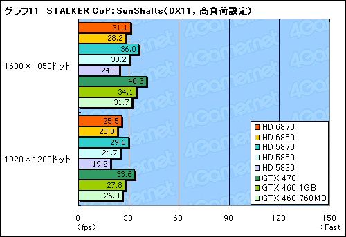 同じくSTALKER CoPから,最も負荷の高い「SunShafts」シークエンスのスコアがグラフ10,11だが,ここだとHD 5870とHD 6870の差が開くだけでなく,HD 6870はGTX 460 1GBの逆転を許し,GTX 460 768MBに並ばれてしまう。HD 6850は言うまでもなくそれよりさらに低く,「振り返ればHD 5830」という状態である。