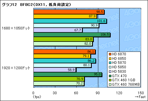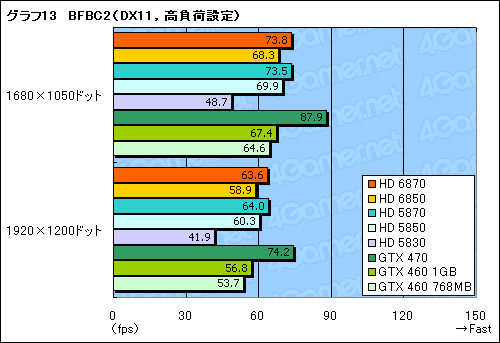 別のDirectX 11タイトルではどうか。グラフ12,13は「Battlefield: Bad Company 2」(以下,BFBC2)のテスト結果となるが,ここでは「HD 6870≒HD 5870」,「HD 6850≒HD 5850」と述べて差し支えない。