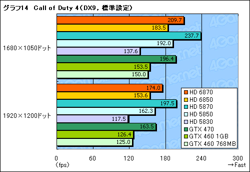 2010年秋を迎えても市場で支配的なのはDirectX 9世代のタイトルだが,おおむね3DMark06と同様の傾向にまとまるのか。グラフ14,15は「Call of Duty 4: Modern Warfare」(以下,Call of Duty 4)のスコアだが,ここでは2つの見方ができそうだ。1つは,「DirectX 9タイトルだと,HD 6870はHD 5870,HD 6850はHD 5850を超えられない。HD 6800の性能はHD 5800から若干低く見積もるべき」ということ。もう1つは,「DirectX 9タイトルにおいて,HD 6870は,NVIDIAが対抗と位置づけるGTX 470と同等かそれ以上の実力を示す」ということである。