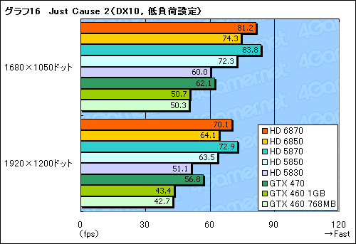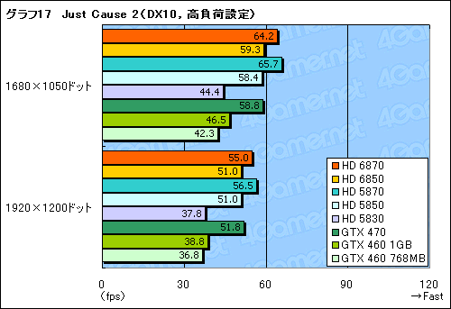 グラフ16,17に示したDirectX 10世代のタイトル「Just Cause 2」だと,GeForce Driver 260.89に問題があるのか,GeForceの3製品が軒並みスコアを大きく落とした。そのためここではRadeon間の比較に留めるが,HD 6870がHD 5870に若干離され,HD 6850とHD 5850がほぼ同じスコアに落ち着いているという意味では,これまでと同等の傾向といえる。