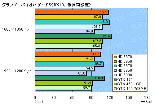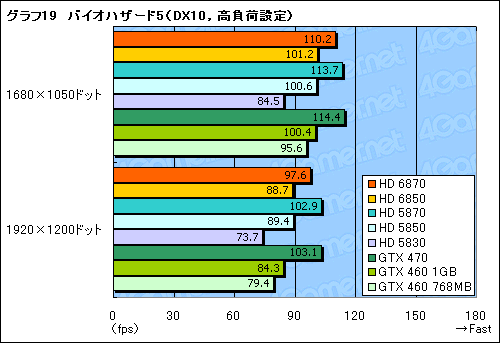 同じDirectX 10世代のタイトルとなる「バイオハザード5」だと,GeForceのスコアが正常と思われる値を示したので横並び比較したいと思う。本タイトルはGeForceへの最適化度合いが顕著なので,グラフ18,19ではGTX 470でHD 5870を上回るスコアが出ていたりするが,そんななかでもHD 6850がGTX 460 1GBに対して優勢な点は押さえておくべきだろう。