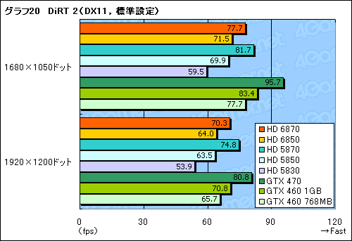 性能検証の最後は,DirectX 11世代の「Colin McRae: DiRT 2」(以下,DiRT 2)である(グラフ20,21)。DiRT 2は,Radeonへ最適化されているにも関わらず,DirectX 11アプリケーションに強いGeForce 400シリーズで高いスコアが出るのだが,やはりというかなんというか,GeForceが強い。AMDが想定する対抗製品,GTX 460 1GBとGTX 460 768MBに対して,HD 6870とHD 6850は付いていくのがやっとで,届いていない場面も見られる。