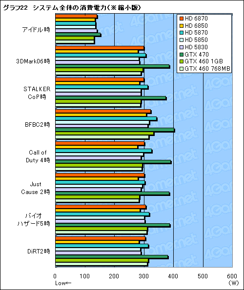 その結果はグラフ22のとおり。グラフが大きくなりすぎたため,縮小版を掲載しているが,まず,アイドル時の消費電力でATI Radeon HD 5800シリーズの27Wから19Wへ低減したという効果は,残念ながらテストからは確認できなかった。