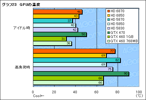 最後にグラフ23は,室温21℃の環境におけるアイドル時と高負荷時のGPU温度を,GPU-Zから測定したものになる。