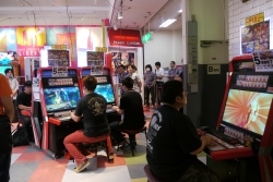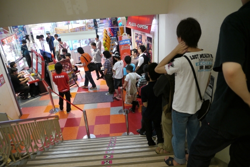 階段の上へ伸びていた,乱入待ちの列。明日以降テストに参加する人は,まずキャラクター選択画面に注目しよう。アーケード版への期待が高まること間違いなしだ