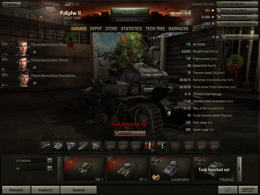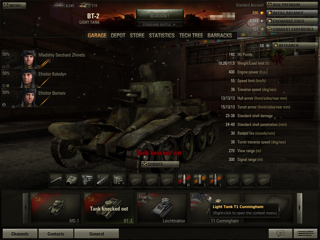 この車庫がプレイヤーの本拠地となり,ここで補給をしたり戦車をリサーチしたり,戦車兵を交代させたり,メールを読んだりいろいろなことができるのだが,最初は「Gold」と呼ばれる資金も少なく経験値もないのでできることは少ない。このGoldは,毎日アクセスするたびに150程度支給される。もっとも,武器の補給や戦車の購入に使うのは「Credit」で,これはGoldを日々のレートで交換することで得られるほか,戦場で活躍したりしても手に入るようだ。ここで「ようだ」と書いたのは,実をいうと筆者はちっとも活躍できないので,なんとなくそうなんだろうなあと思うしかないわけだ。てへへ。