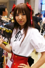 「剣と魔法と学園モノ。」シリーズを中心とした物販を展開していた。声優さんの色紙がプレゼントされる抽選会も見てみたかったが,今回は断念。代わりといってはなんだが,こちらのコンパニオンのお二人の写真で我慢してほしい。