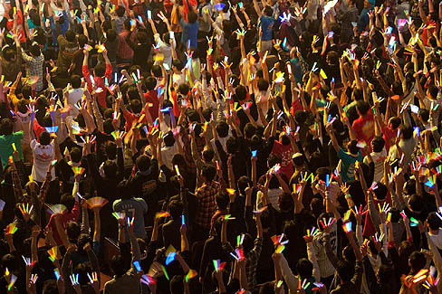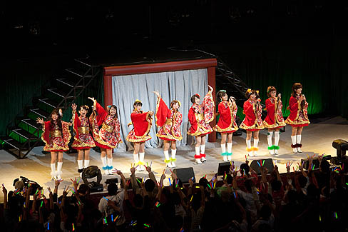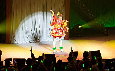 今回初めてライブを見て,全部ではないけど,そうしたフラストレーションの一部が解消された,などと言うと単純過ぎるだろうか? 実際,声だけでも十分,ゲームに出てくる彼女達がきらめくステージに立っているような気がして,オープニングからおしまいまで,関係者席でニヤニヤしっぱなしだ。自分でも,ちょっとどうかと思うのだが,春香役の中村繪里子さんが登場し,ファンの持つケミカルライト(通称,サイリウム)が一瞬にして真っ赤になったとたん,おお,みんなが春香さんを応援している! よかったなあ,春香,嬉しいなあ,と赤い光が不覚にも滲んで見えたのは,誰にも言えない秘密だ。