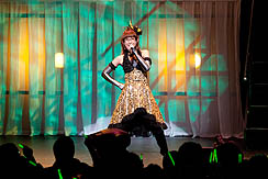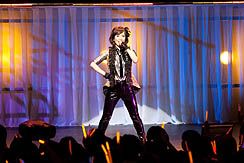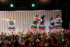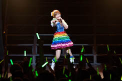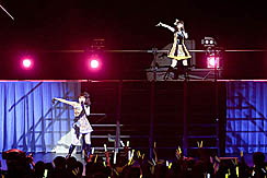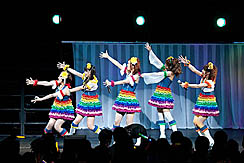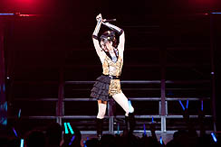 さて,ライブもこのあたりまでくると,私もウズウズ状態もピークに近い。1階バルコニーに設けられたメディア席から見る会場は光の乱舞で,言うまでもなく観客のテンションは非常に高いのだが,私のいるメディア席だけはまるで水を打ったように静まりかえっており,何の曲だったか忘れたが,「さあ,皆さんご一緒に」とマイクを向けられたときも沈黙。うう,歌えるのに,オレ。さらに「1階の皆さん,お元気ですかー」という声にも,沈黙を以て報いるという状況で,まあ,当然ですけどね。メディアだし。さびしいなあ。