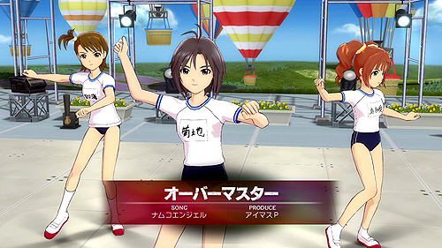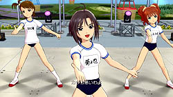 ちなみに下に掲載したスクリーンショットでは,菊地 真と高槻やよいが体操シャツの裾をブルマーの中に入れているが,双海亜美は外に出している。はて,これはどちらが正式なのだろう? 私の学生時代はあまりにも昔のことで,全然覚えていないなあ……とかなんとか言いながら,じーっとスクリーンショットを見つめる私は,ふと気がつくと五十台。