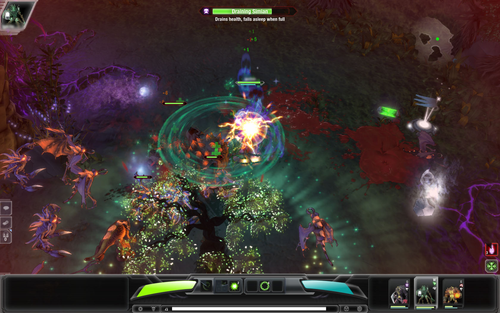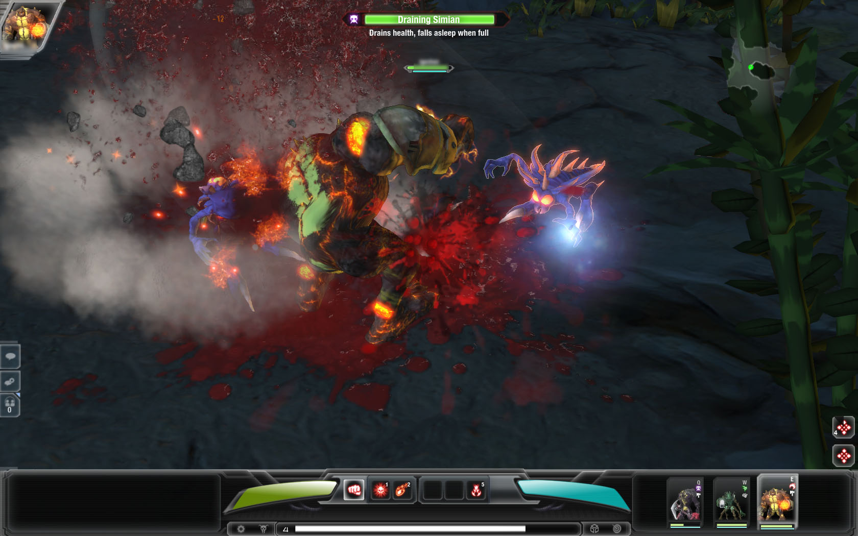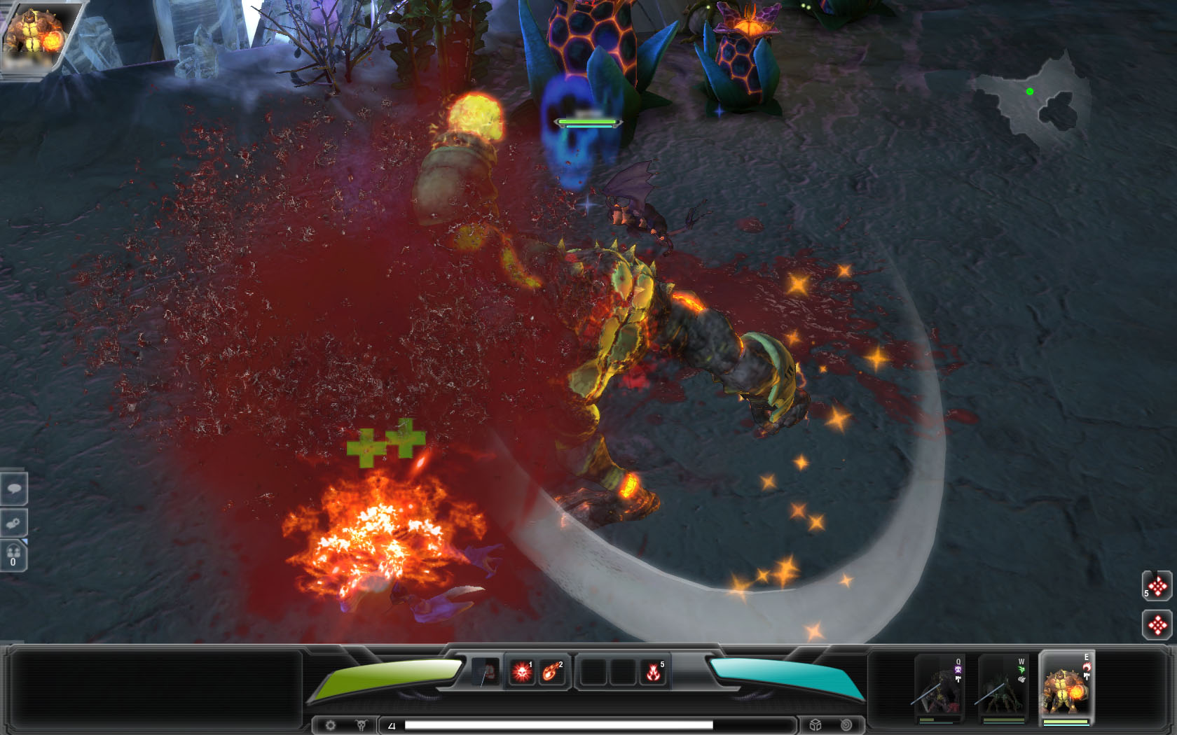 プレイヤーが操作するのは上記のようにHeroという生命体なのだが,これが名前とは裏腹に,まさにクリーチャーといったグロテスクな外見をしている。攻撃方法としては,爪で引き裂いたり,斧で切り刻んだり,銃で攻撃したりなどの基本的なもののほかに,隕石を降らしたり体力を回復させる木を生やしたりといった,さまざまな特殊スキルも持っており,レベルアップによってそのスキルが増えていく。