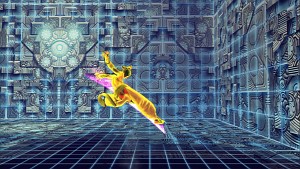 空中から斜め下方向へ突進して蹴りを放つ。弱版がもっとも急降下の角度が緩く,強版がもっとも鋭角に突進する。前方,垂直,後方とジャンプの方向を問わず出すことが可能で,またヒット時は相手を浮かせる効果があって,ヒット時の見返りも大きい。ちなみにヒット,もしくはガードされたときは,追加入力を行うことで,派生技の弐の閃,参の閃へ移行できる。EX版は追加入力せずとも参の閃まで自動で発動し,ヒット時は壁バウンドを誘発する。ボタン同時押しの組み合わせで突進角度も変化させられ,「弱K中K同時押し」がもっとも鋭角,以降「中K強K同時押し」→「弱K強K同時押し」の順番で緩やかになっていく。![]() 疾空閃 |