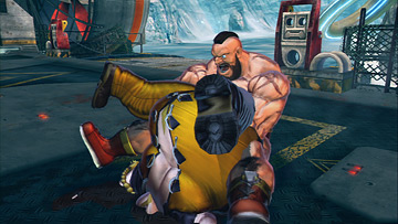 相手の攻撃を耐えるアーマー状態のまま両腕を広げて前進し,目の前にいる相手をつかんで地面にたたきつける特殊な投げ技。コマンド入力直後に相手が目の前にいた場合は,自動的にアトミックスープレックスに変化する特性もある。スーパーチャージ対応技で,ボタンを押し続けている間はアーマー状態が持続するため,相手の攻撃を受け止めてからボタンを離して反撃する,といった使い方もできる。![]() |