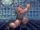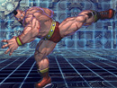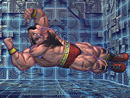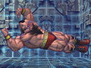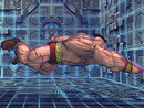相手をつかまえてジャンプし,回転しながら相手を地面にたたきつける伝統のコマンド投げ。弱版がもっとも相手をつかむまでのタイミングが早いうえに有効な間合いが広く,強版は攻撃の発生が遅く間合いが狭い。そのかわり,威力は強→中→弱の順番で高い。弱版なら密着からしゃがみ弱Pを4発ガードさせた程度の離れた間合いでもつかめるので,狙うチャンスは非常に多い。EX版はつかむまでが無敵状態なので,相手の攻撃に割り込むのに役立つ。![]() |