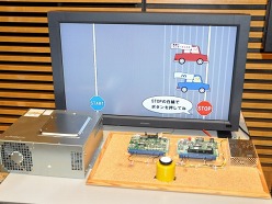 ![]() 左が従来のシステムで使用されてきた「JVS」の基板で,右が高速I/Oインタフェースの基板。手前のボタンを押すことで,画面上の車が止まる仕組みだが,JVSでは若干のズレが生じることが確認できる |