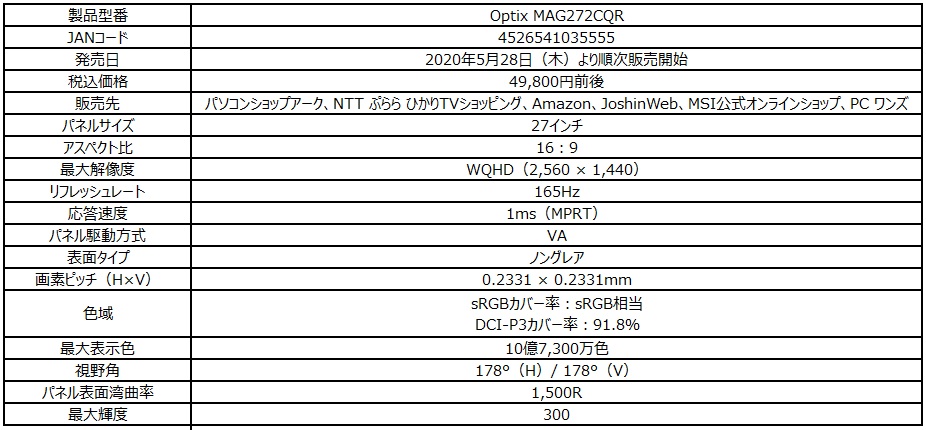 MSI,165Hz表示&HDR対応の27型ゲーマー向け液晶ディスプレイを国内発売