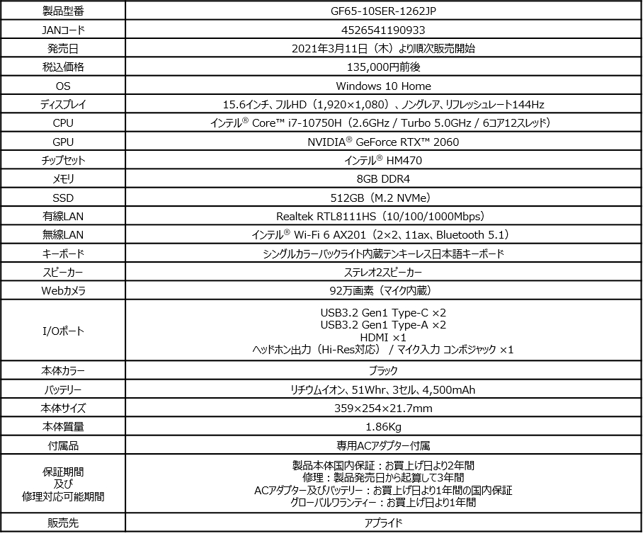 MSI,RTX 2060搭載で税込13万5000円前後のゲームノートPCをアプライド限定で発売