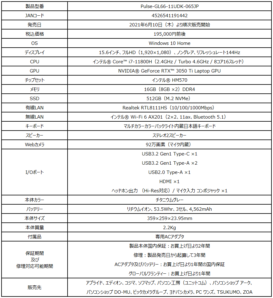 MSI,RTX 3050 Ti&i7-11800H搭載の15.6型ゲームノートPCを発売