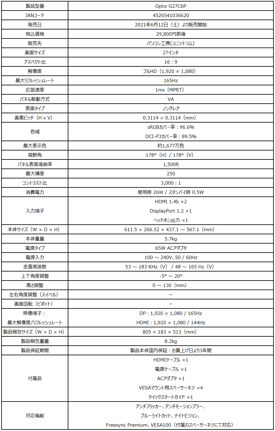 MSI,165Hz表示対応で,税込約3万円の27インチフルHDディスプレイをパソコン工房限定で発売