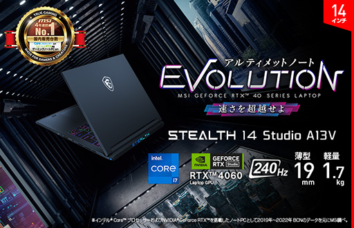 「Stealth 14 Studio A13V」は、薄さ19mm・軽さ1.7kgの14インチタイプの本体に「GeForce RTX 40シリーズ Laptop GPU」を搭載した薄型・軽量・ハイエンドゲーミングノートPCです。