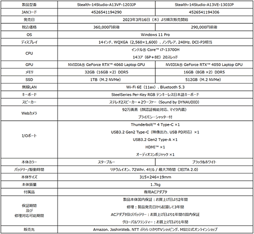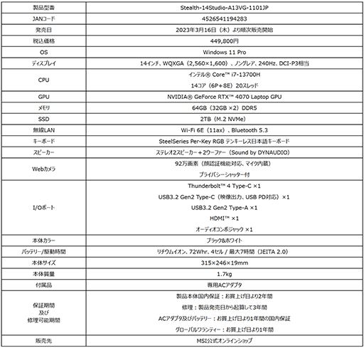 「Stealth 14 Studio A13V」オンラインストアモデルを2023年3月16日(木)より発売