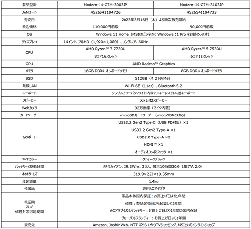 また、最新世代の「AMD Ryzenプロセッサー」を採用し、ハイブリッドワーク用や家庭用として高い処理性能とお手頃価格の両立を実現した14インチタイプビジネスノートPC「Modern 14 C7M」シリーズに加え、これからPCゲームを始めたいというビギナーゲーマーに最適な性能・機能・コストパフォーマンスを実現した「GF63 Thin 11U/11S シリーズ」のオンラインストア向けモデルも同時発売いたします。