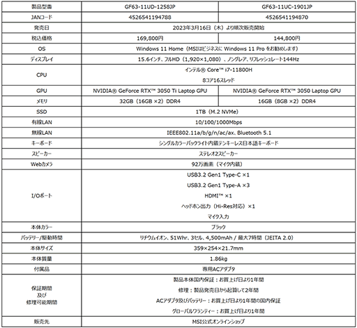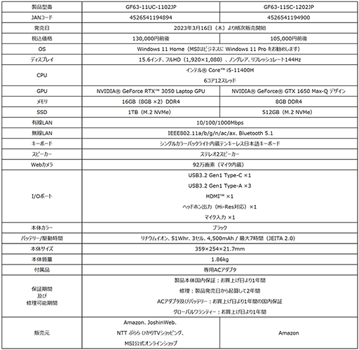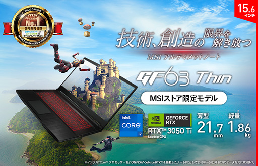 薄型・軽量・高コストパフォーマンスゲーミングノートPC MSIストア限定モデル「GF63-11UD-1258JP」「GF63-11UC-1901JP」