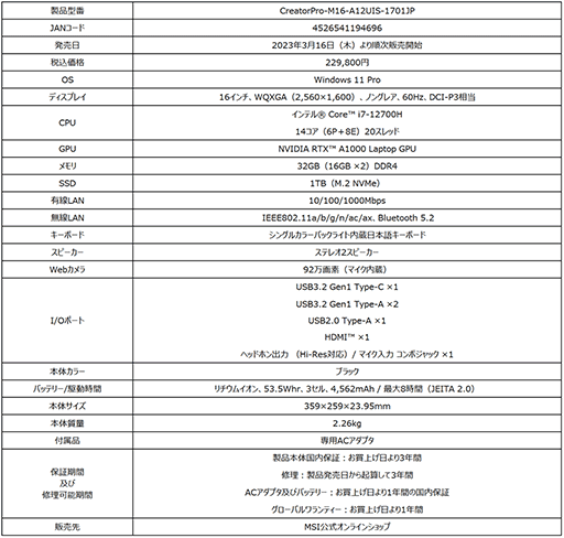 【CreatorPro-M16-A12UIS-1701JPの主な特徴】