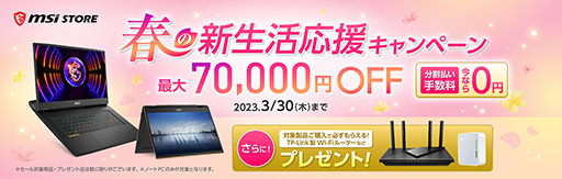 『MSIストア春の新生活応援キャンペーン』では、最新モデルを含む対象ノートPCが通常販売価格より最大70,000円OFFになるセールに加え、対象ノートPCをご購入いただいた方に先着順でTP-Link製Wi-Fiルーターなどをプレゼントいたします。さらに、ショッピングクレジットによる分割払いにて合計30,000円(税込)以上の商品をご購入で、最大60回払いまでの分割金利・手数料が無料になる「分割払い手数料無料キャンペーン」も同時開催中です。