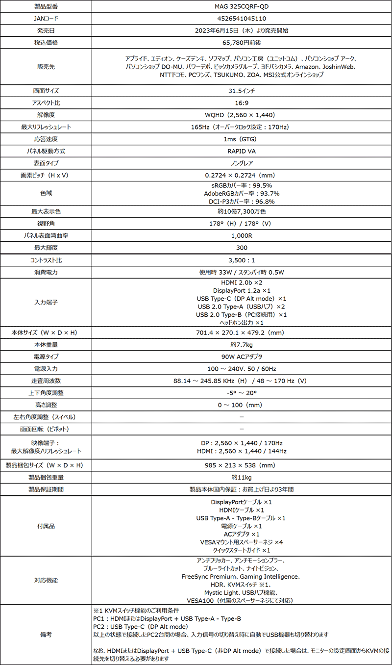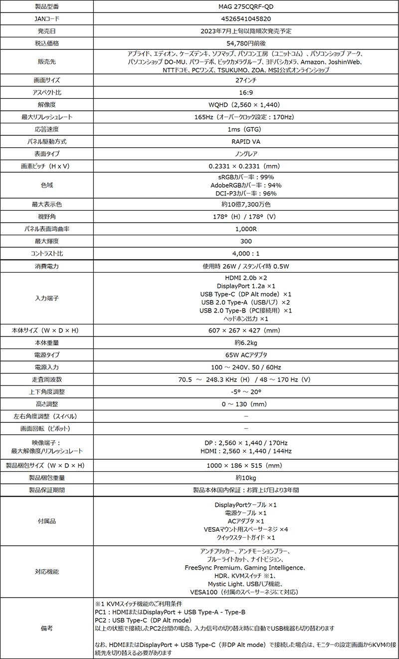 量子ドットVA液晶を採用する湾曲型ゲーマー向け液晶ディスプレイがMSIから。31.5型と27型の1440pモデルを用意