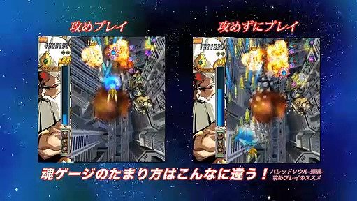 本作には,プレイヤーのアグレッシブさに応じて魂ゲージが溜まっていき,これが多いほどスコアにかかる倍率が上がっていくというシステムが用意されている。ムービーでは,敵の目の前にガンガン突っ込むプレイと,画面下で回避を優先しながら敵を倒すプレイの2パターンを確認できるのだが,明らかに前者のほうがゲージの溜まりが早い。