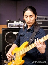 ![]() 榎本 敦氏(ベース) 最近,ゲーム音楽関係で演奏させていただくことがあるのですが,今回はハードな曲も多いので,体力を付けて,気合いを入れてがんばります |