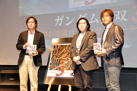完成披露会では,本作のプロデューサーであるバンダイナムコゲームスの後藤能孝氏と,コーエーテクモゲームスの鯉沼久史氏,そして「機動戦士ガンダムUC(ユニコーン)」の小説版著者である福井晴敏氏が登場。ガンダム無双3を応援するブロガー50人を招いて開催された本イベントの内容をお伝えしよう。