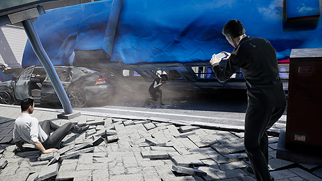 VR DEMOの開始地点からの眺望。まるで自分自身が本当に地震災害に見舞われた街に降り立ったかのような感覚を味わえる。 |