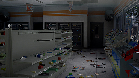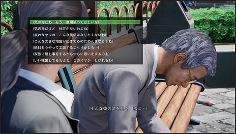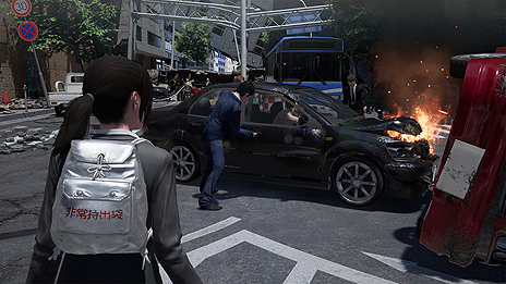 この男性はショールームに突っ込んだ乗用車を運転していたようだ。本作では、様々な被災者から情報を入手したり、協力したりすることで震災から生き延びることを目指す。 |