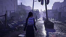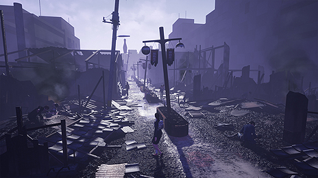 ここは、巨大地震から数日経った後、大きな火災が発生し焼け落ちた街。主人公は、朝この街にやってきた。 |