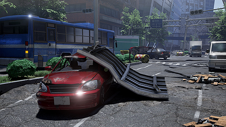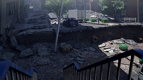 大きく隆起・陥没した道路。陸橋を渡って脱出を試みるも、陸橋は途中で大きく崩落しており脱出できない。足元が不安定な中、地震に注意しながら進まなければならない。PSVR対応により、高さによって感じる恐怖も今まで以上。 |
